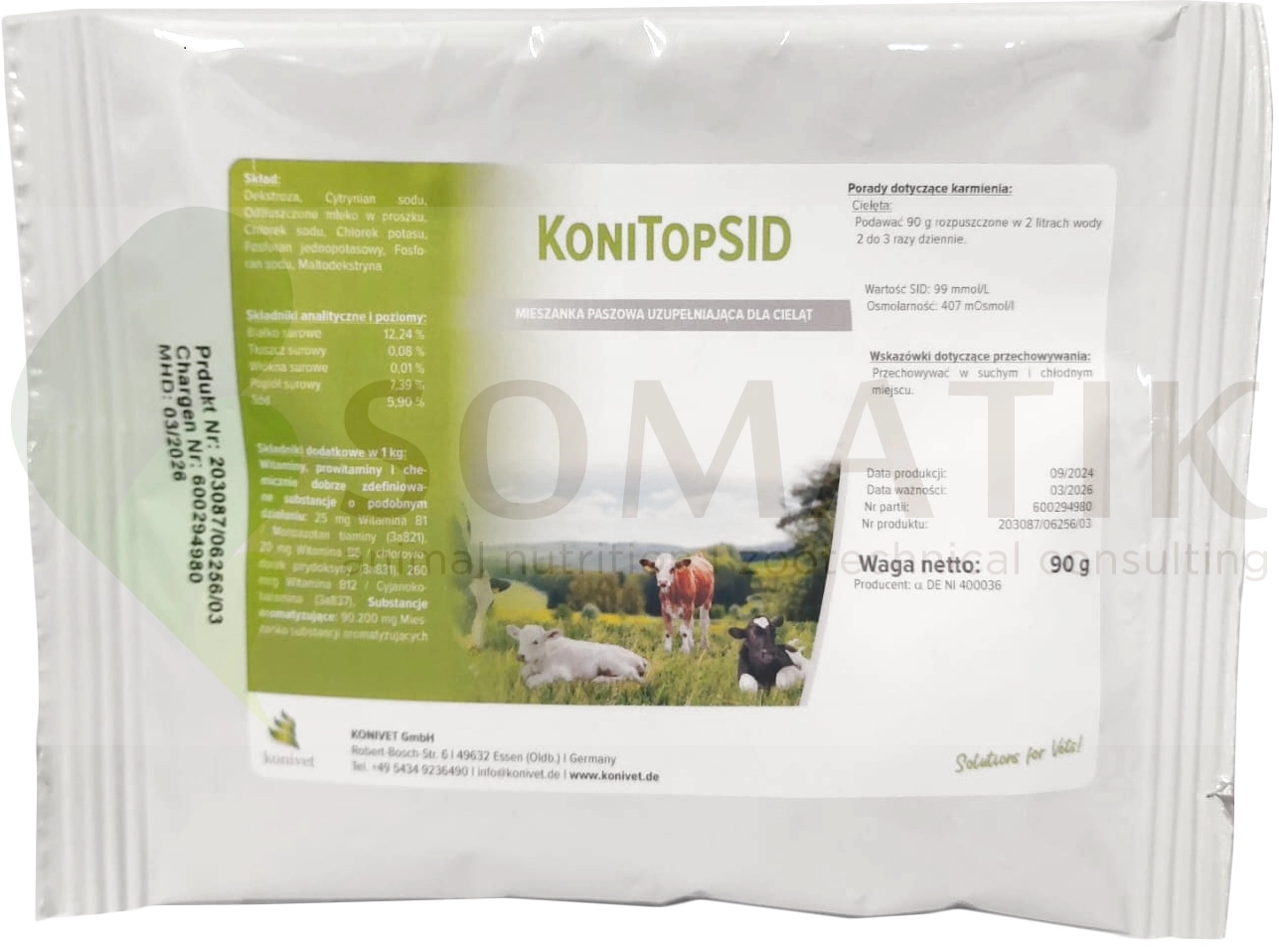 Dodatkowo KoniTop SID zawiera kompleks witamin i łatwo przyswajalne źródła energii, co pomaga przywrócić sprawność metaboliczną i siły. Jedna dawka dostarcza energii na poziomie porównywalnym do 1,2 l mleka zastępczego.