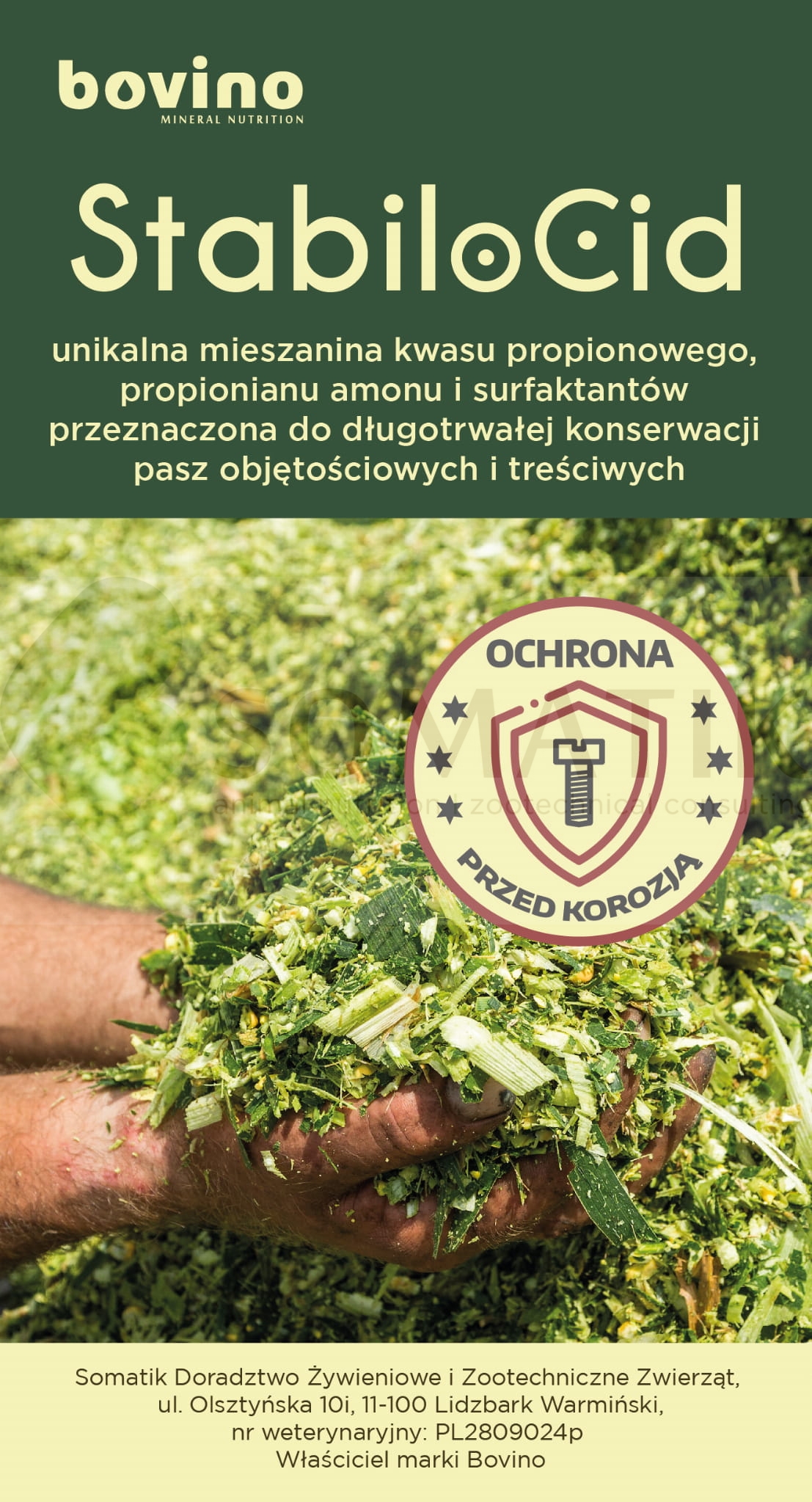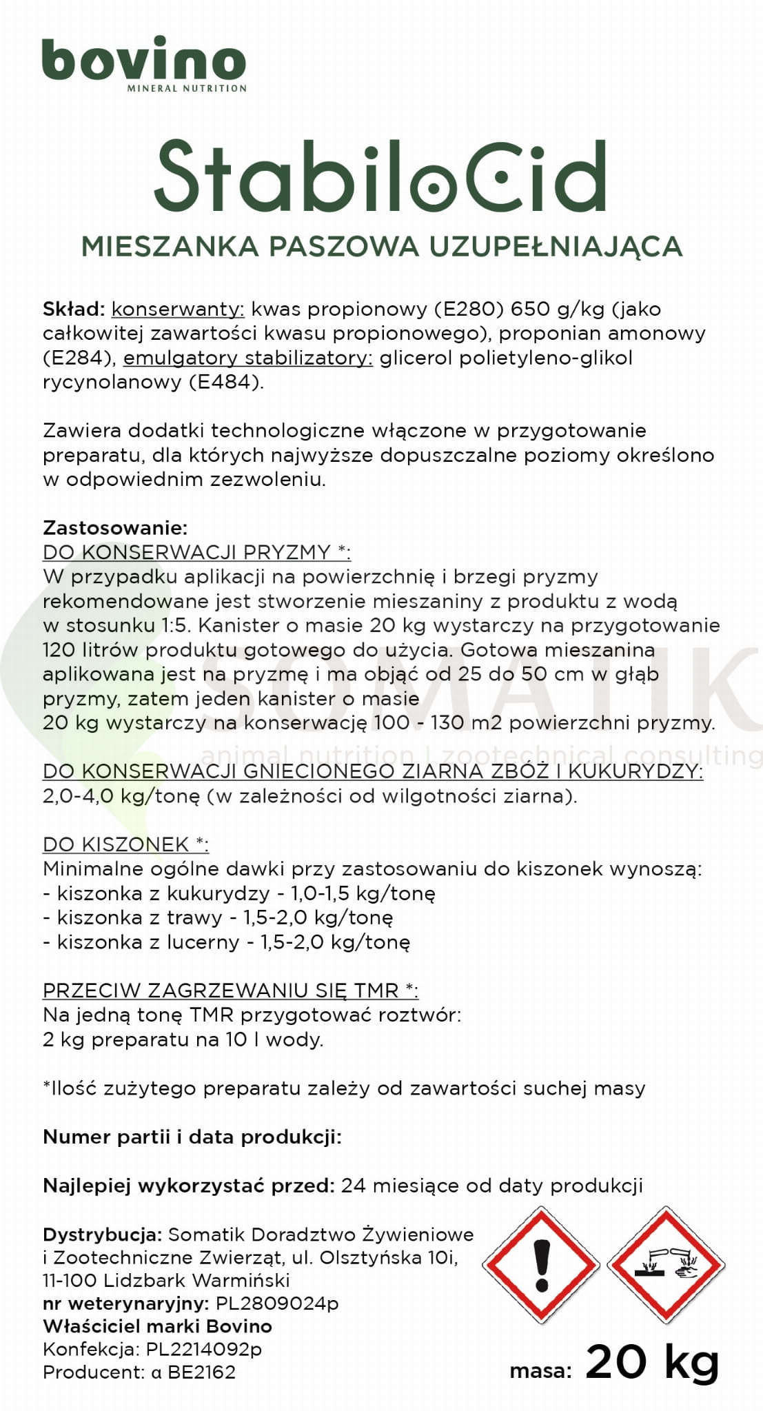 STABILO CID - preparat do konserwacji pasz objętościowych i treściwych w celu ograniczenia rozwoju grzybów, pleśni i bakterii chorobotwórczych w paszach. Przeciwdziała zagrzewaniu się mieszanek TMR na stole paszowym. Stosowany do zabezpieczania pryzm i silosów wydłuża stabilność tlenową pasz objętościowych.